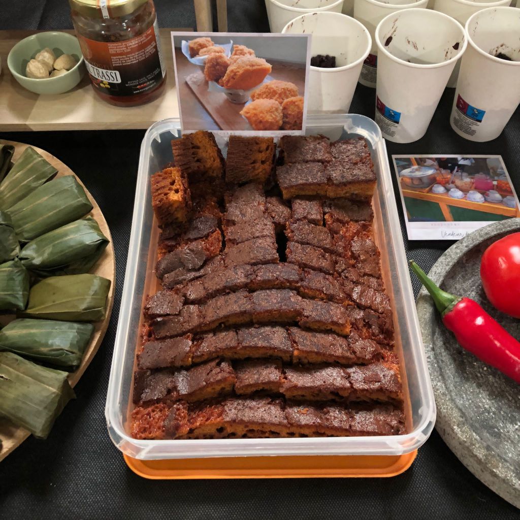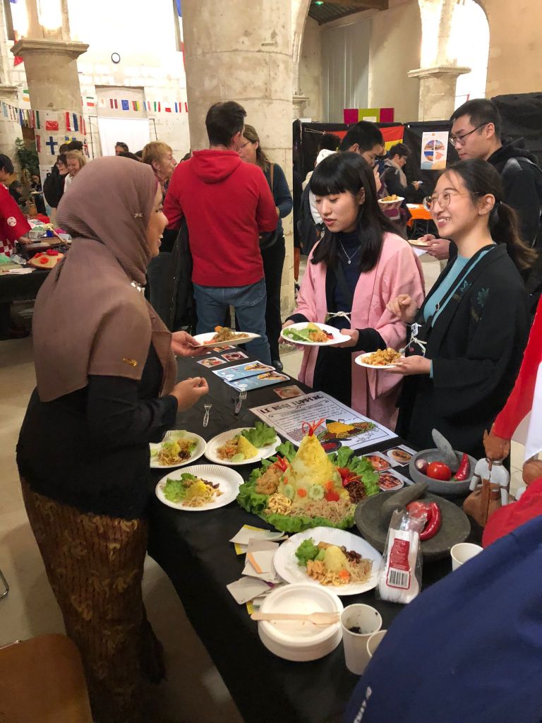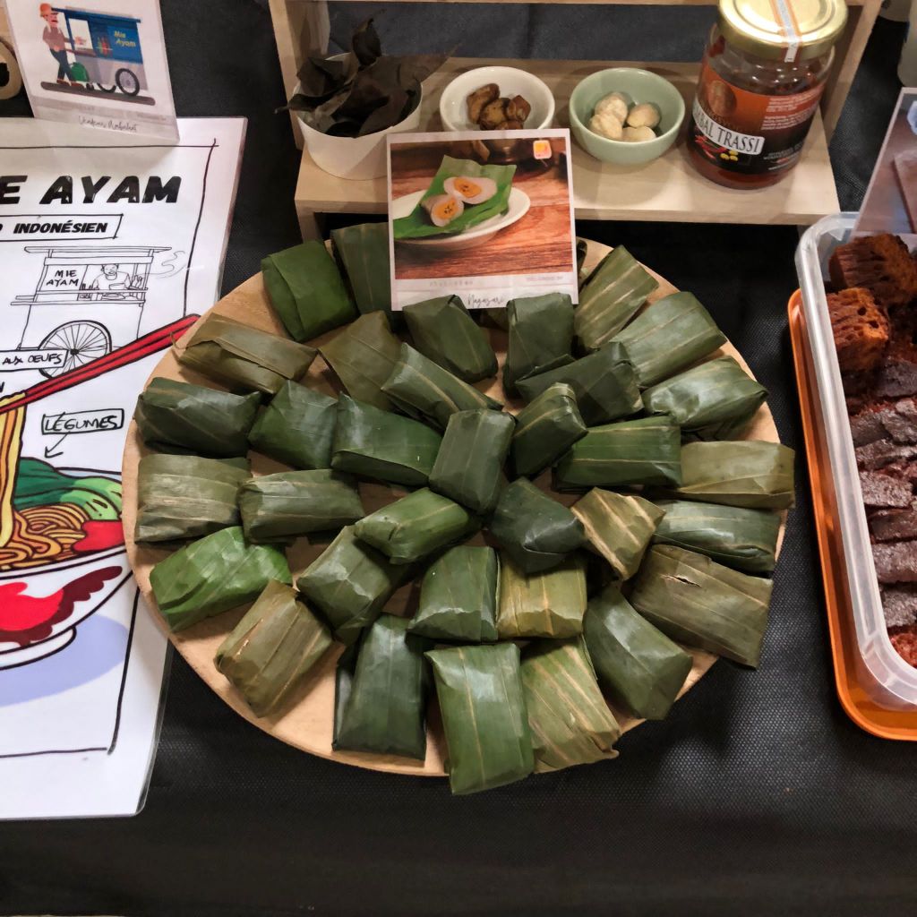 Gulalie collaborait avec le PPI La Rochelle, l’association des étudiants indonésiens de La Rochelle. Nous avons présenté une dégustation de cuisine indonésienne. Les visiteurs ont été émerveillés par la nourriture servie sur le stand indonésien, comme le riz ‘Tumpeng’ – le riz jaune parfumé en forme d’un volcan avec ses condiments : du ‘tempeh’, du poulet et des œufs, ainsi que les desserts traditionnels comme le ‘dadar gulung’ – un rouleau de crêpe aux noix de coco rapés et au sucre de coco, et le ‘bubur ketan hitam’ – un dessert sucré à base d’une bouillie de riz gluant noir, de lait de coco et de sucre de coco. Le riz tumpeng présenté par les étudiants indonésiens était côte à côte avec le ‘Mi Ayam’ – la soupe des nouilles aux poulet qui est connu comme la cuisine de rue en Indonésie, préparé par Gulalie Épicerie. Pour les desserts, j’ai préparé le Bolu Sarang Semut ou le gâteau au caramel et le Nagasari.