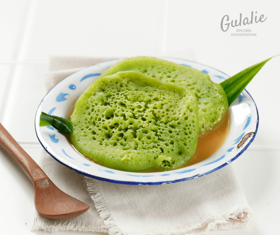 Le Serabi au pandan à la sauce de sucre de coco est un gâteau traditionnel de Java Ouest. Il est fin comme un pancake. La texture est douce et moelleuse grâce au mélange de farine de riz, farine de blé et tapioca. L’arôme exotique vient de la feuille de pandan. Il est servi avec la sauce “kinca” – un mélange d’eau, de lait de coco et de sucre de coco.