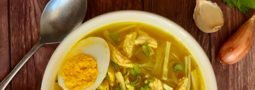 Chaude, riche, avec un coup d'arôme de citronnelle et de feuilles de citron. Le curcuma donne la couleur jaune. Voici la recette pour 8-10 personnes : 1 poulet3-4 litres d'eau À moudre : 7 gousse d'ail7 pièces d'échalote2 noix de Kemiri2 cm du gingembre3 cac curcuma moulu Autres ingrédients: 2 citronnelles5 feuilles de citron vert/… Continue reading Soto Ayam : La meilleure escapade en automne